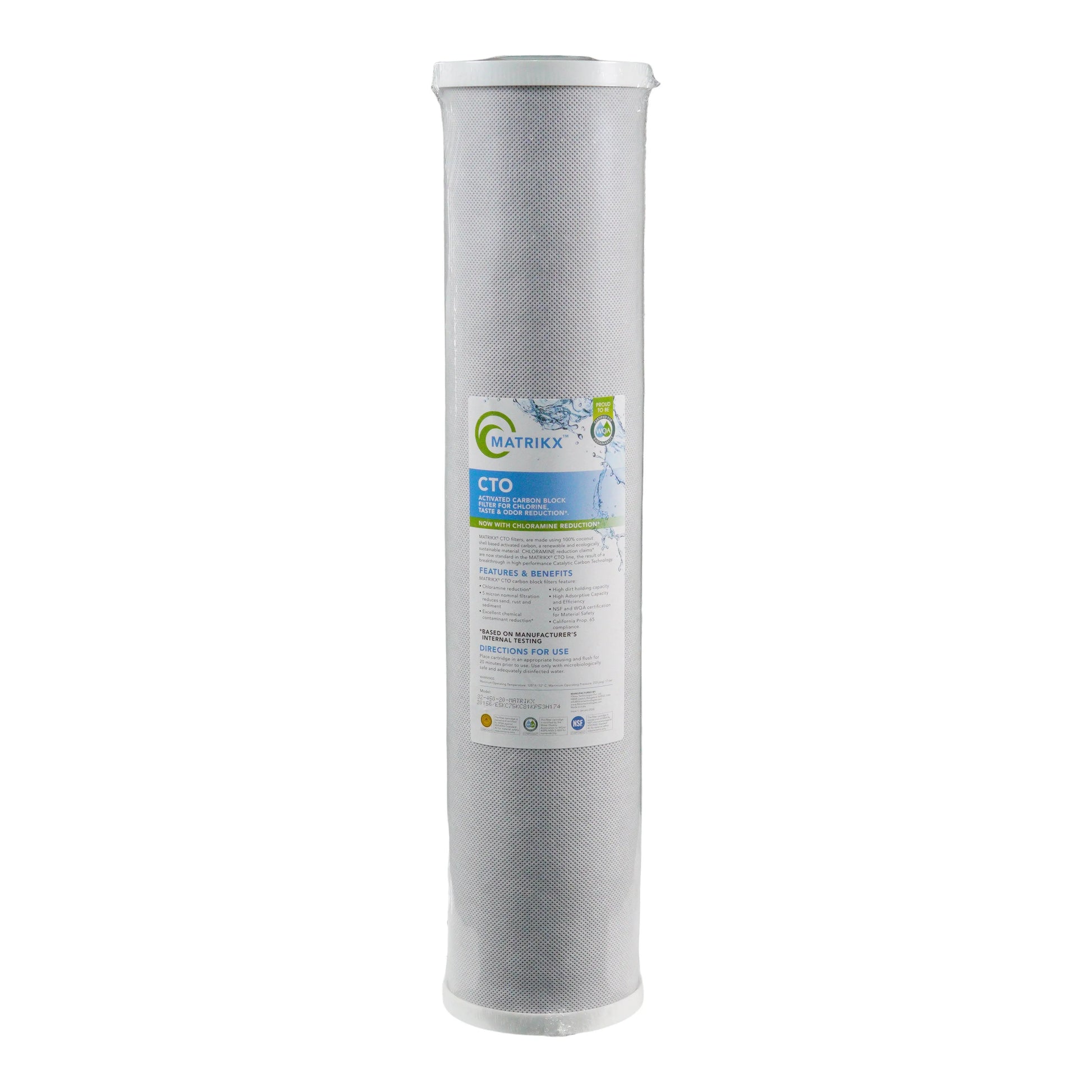Ce filtre à eau à bloc de carbone haute capacité KX Matrikx CTO d'origine élimine les produits chimiques et les odeurs de votre eau tout en améliorant le goût de votre famille. S'adapte à tous les boîtiers de filtre à eau BIG BLUE de 20" pour la filtration de l'eau dans toute la maison. Peut être installé dans les deux sens, ce qui le rend beaucoup plus facile à installer pour le "Bricoleur". 100 % compatible avec de nombreux boîtiers de filtre à eau. Le filtre est de 4 1/ 2" par 20" de taille.